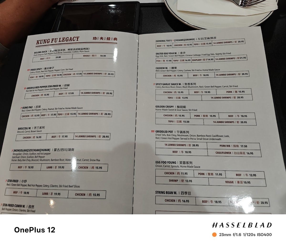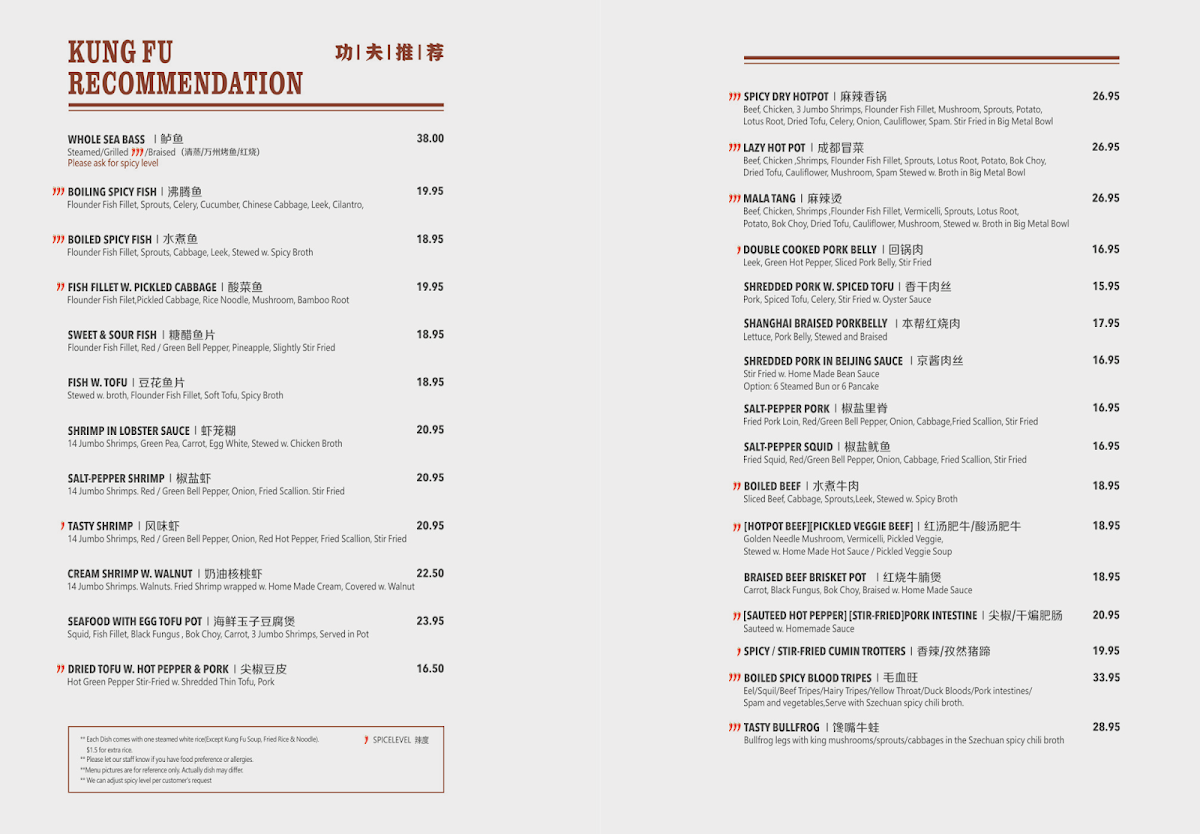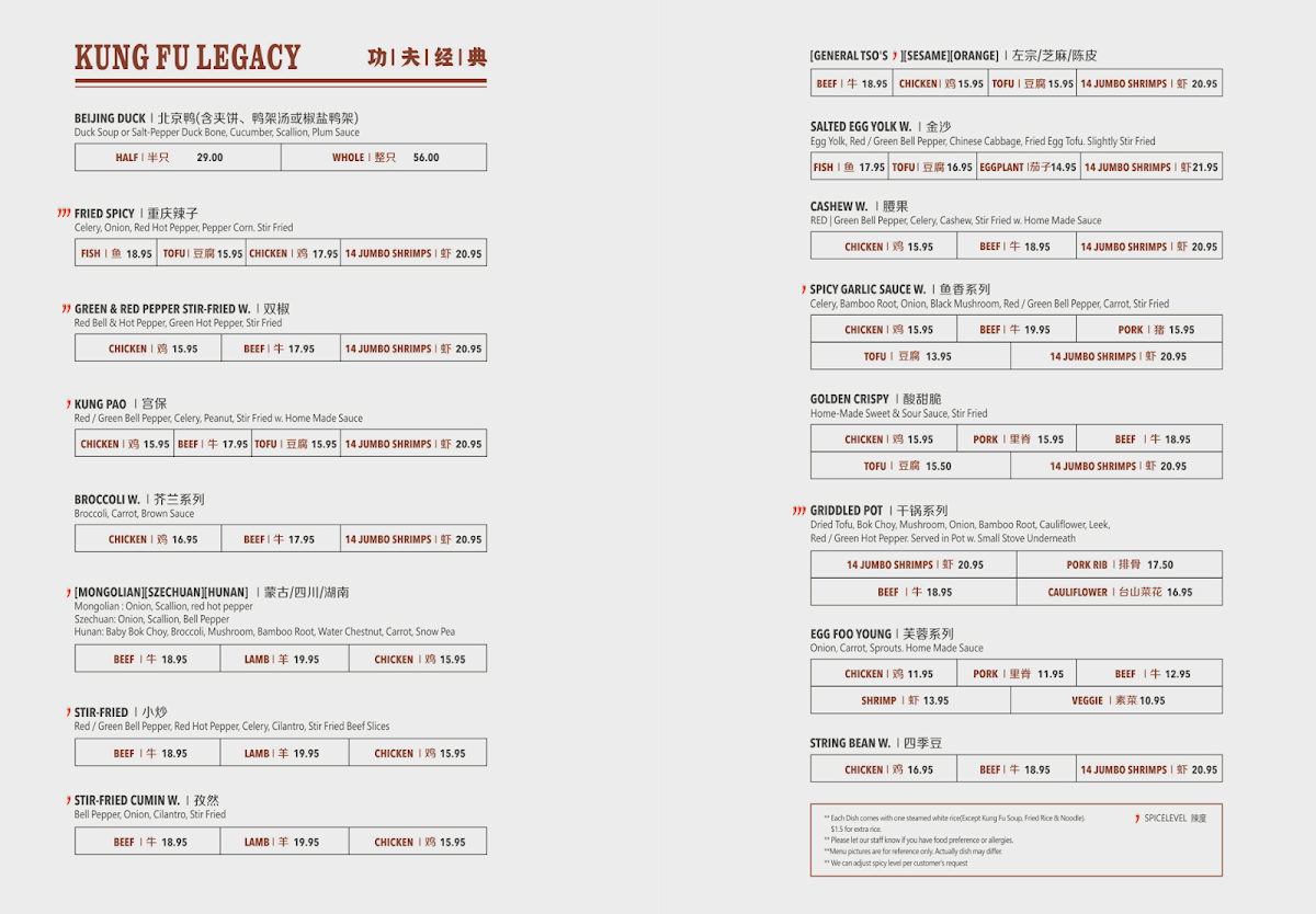 Lastly, the Kung Fu Recommendation section brings unique choices like the Cream Shrimp W. Walnut ($16.95) and the Lazy Hotpot ($12.95), while the Kung Fu Legacy section features beloved classics such as Szechuan Beef ($13.50) and the Golden Crispy Chicken ($14.50).