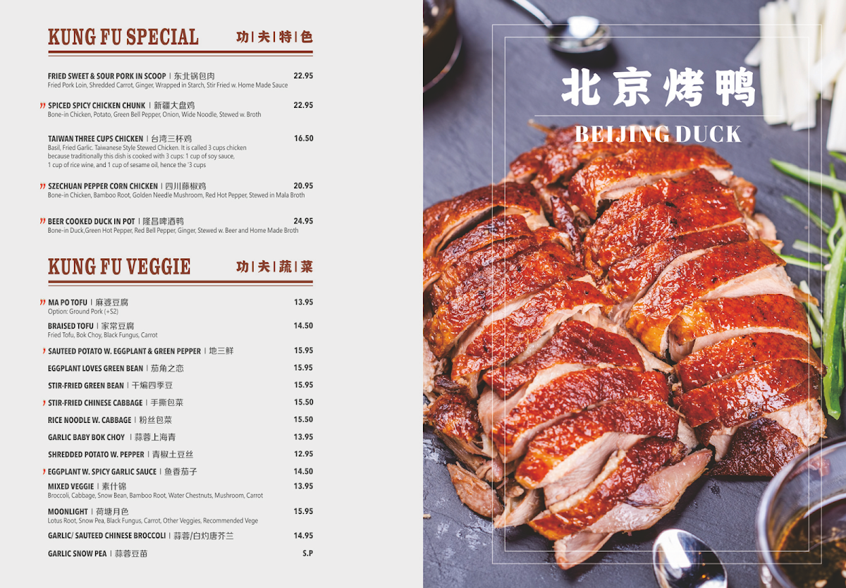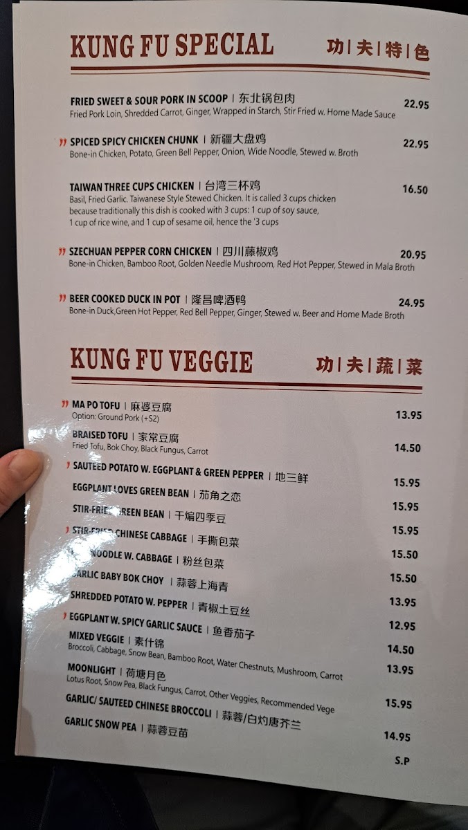Vegetarian diners will enjoy the Kung Fu Vege section, featuring dishes like Sautéed Potato W. Eggplant & Green Pepper ($8.95) and Stir-Fried Green Bean ($9.95), both packed with fresh flavors. The Garlic Baby Bok Choy ($7.95) and Broccoli W. Spicy Garlic Sauce ($9.50) are also excellent side dishes that complement any meal.