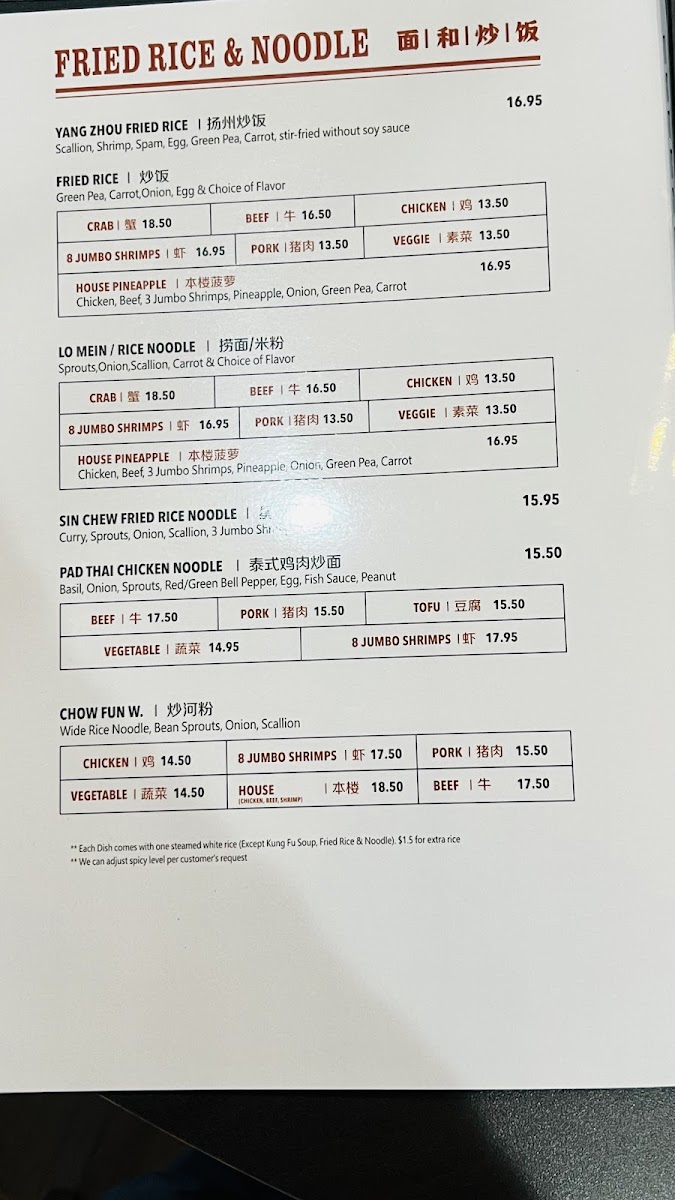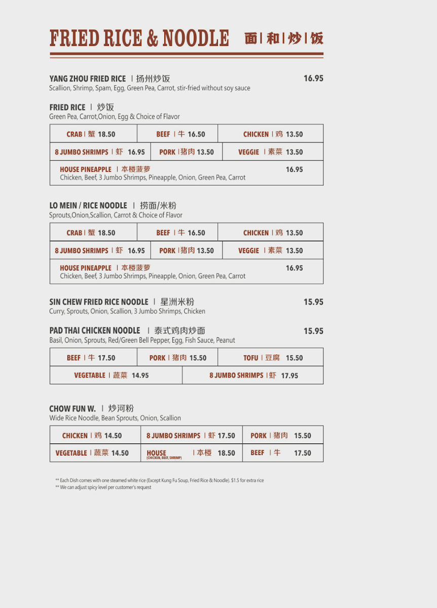 The Kung Fu Fried Rice & Noodle section offers satisfying options like the Veggie Fried Rice ($8.95) and the delicious Shrimp Chow Fun ($12.50). If you're craving something a bit more exotic, try the Pad Thai Noodle Chicken ($10.95) or Pad Thai Noodle Beef ($11.95).